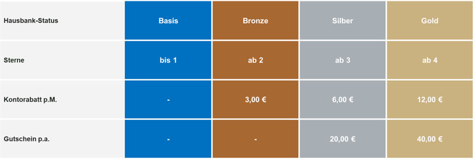 Wir belohnen treue Kunden der Volksbank Raiffeisenbank Niederschlesien eG mit einem günstigeren Kontopreis. Mit unserem Hausbankmodell können Sie einen Rabatt von bis zu 12,00 € auf den Grundpreis Ihres Girokontos erhalten.